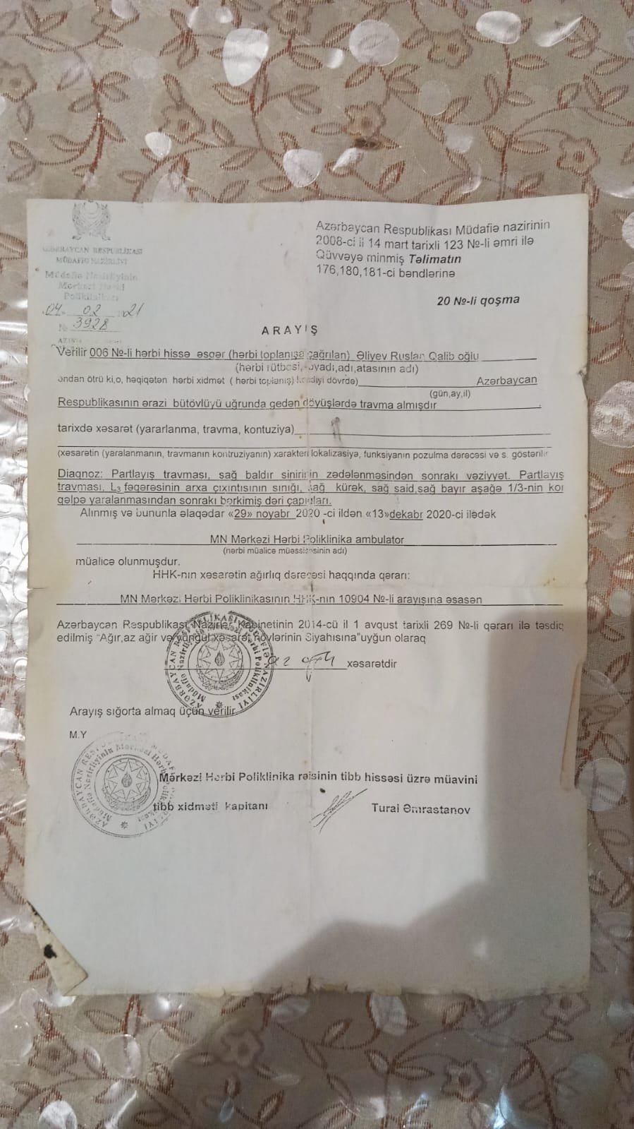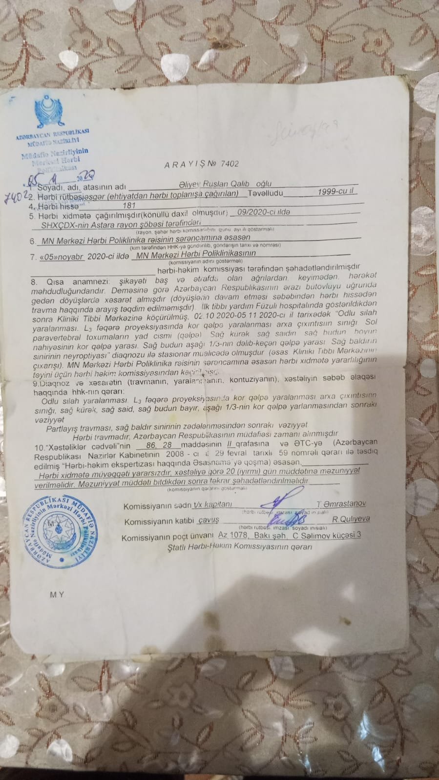Cənab Prezidentdən, Mehriban xanımdan və bütün aidiyyəti dövlət qurumlarından xahiş edirəm ki, vəziyyətim nəzərə alınsın, səhhətim obyektiv şəkildə qiymətləndirilsin və mənə qanunauyğun şəkildə pensiya və müvafiq sosial yardım təyin edilsin.